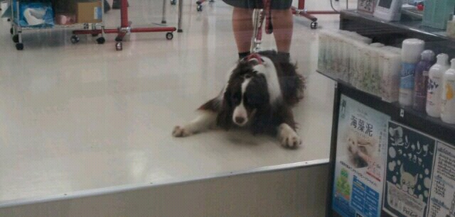 引っ張って逃げようとするけど、床が滑って這いつくばってしまったようです(-_-;)