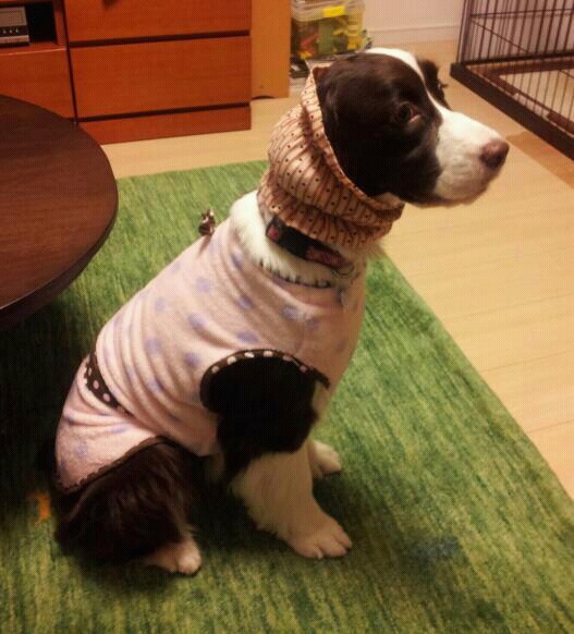 レインコートがないので、ママお手製の服とスヌードでお出かけです。
