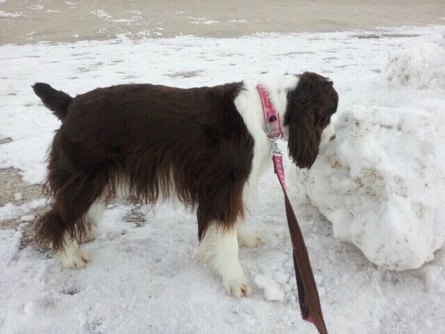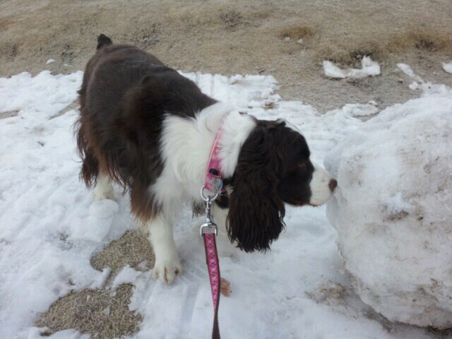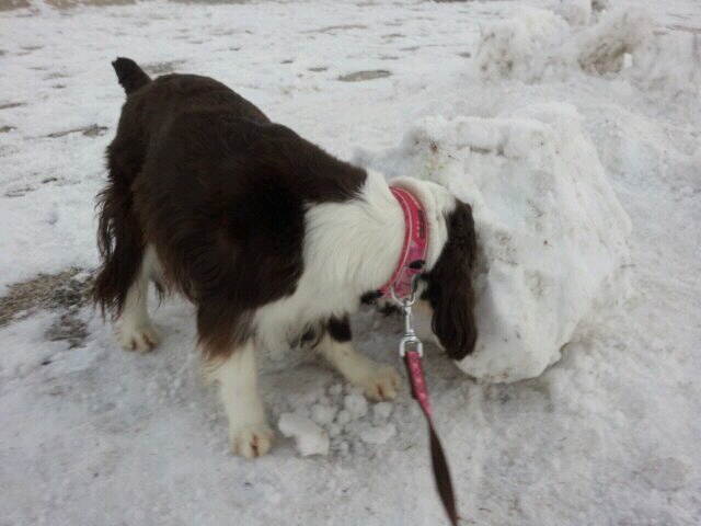 誰かが作った雪だるま?の残骸にどこかのワンコがマーキングした臭いを嗅いでいるアシュリー(-_-;)