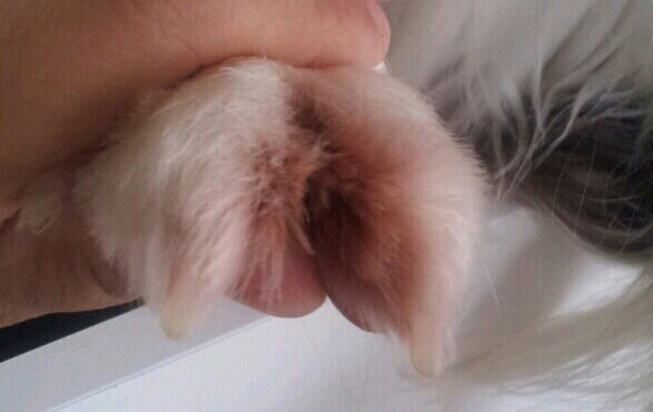 この夏あたりから、右顎の下と前足の水掻き部分の毛が、茶色く変色(というか着色)し始めました。