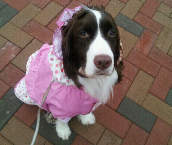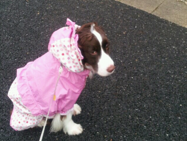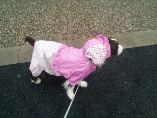 で、朝の散歩は久しぶりにレインコートを着せてみました。