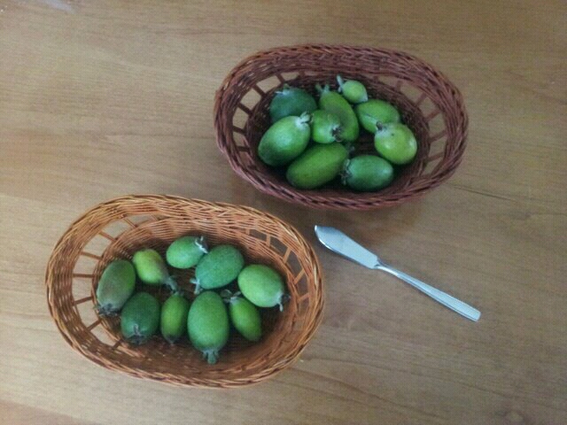 週末の朝の散歩は少し足を伸ばして、フェイジョアの垣根を偵察に行った。