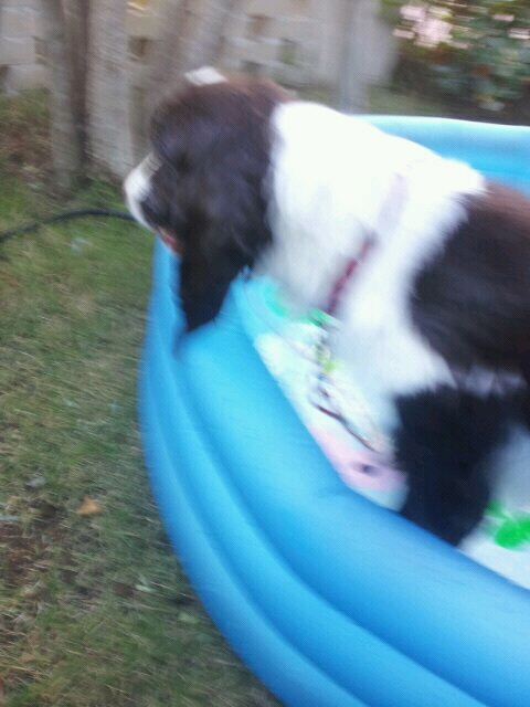 まだ川とかには連れていったことはないけど、暑い日が続くので、庭でプールに入れてみました。